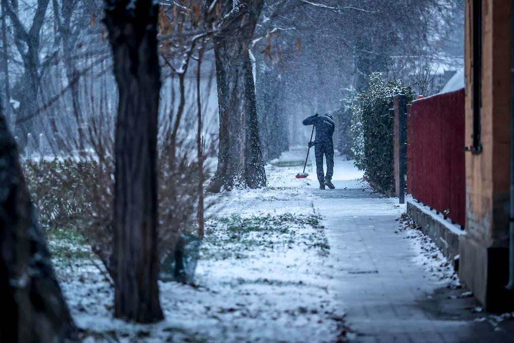 1月5日,在匈牙利布達(dá)佩斯,當(dāng)?shù)鼐用裨诖驋呗访娣e雪。新華社發(fā)(鮑洛格·達(dá)維德 攝)