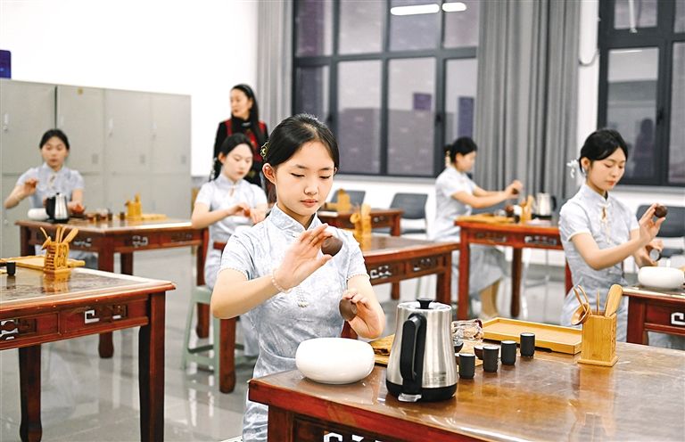 1月9日,旅游專業(yè)的學(xué)生在展示茶藝。當日,呼和浩特市文化藝術(shù)職業(yè)學(xué)校開展了專業(yè)課期末考試暨期末專業(yè)觀摩活動。學(xué)生們以精彩的展演展示學(xué)習(xí)成果。近年來,呼和浩特市持續(xù)深化職業(yè)教育教學(xué)改革,積極構(gòu)建“一核引領(lǐng)、三軸聯(lián)動、全域貫通”發(fā)展格局,為經(jīng)濟社會發(fā)展提供人才支撐。草原云·正北方網(wǎng)記者  王磊  攝