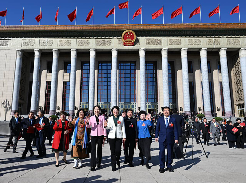 3月11日上午,全國政協(xié)十四屆四次會議在北京閉幕。委員們走出會場合影留念。草原云記者 韓卿立 攝